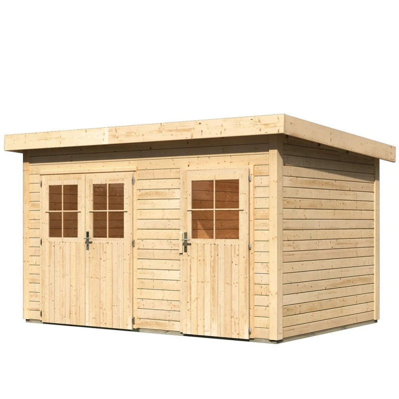 L’abri de jardin en bois 8,88m² Tintrup Karibu vous surprendra par sa belle hauteur à l’intérieur et son toit plat qui lui confère un look tendance. Nous vous conseillons de remplacer le feutre bitumé inclus par une couverture autoadhésive, disponible en option afin d’obtenir une meilleure étanchéité.