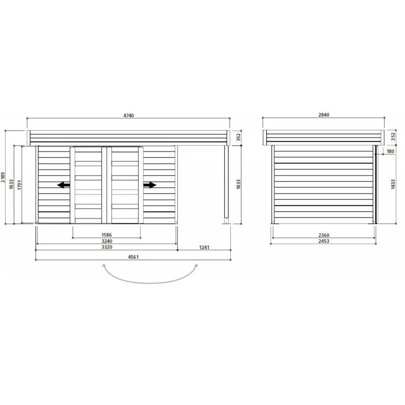 L’abri de jardin Larvik possède un look contemporain et moderne avec sa terrasse couverte, et il pourra être personnalisé pour répondre exactement à vos besoins et à votre inspiration. L’abri a une façade de 332cm comprenant une porte double coulissante exclusive avec 5 panneaux en verre trempé. D’une surface totale de près de 13m², la construction se compose d’un abri fermé de dimensions 332x245cm accolé à une surface couverte de dimensions 124x245cm.