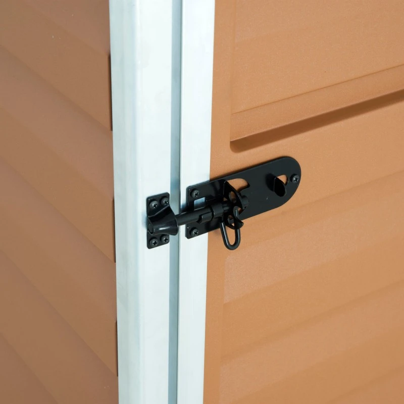 Deux grilles de ventilation sont placées sur les pignons, pour un renouvellement permanent de l’air. La large porte verrouillable (100x171cm) offre un accès aisé, et son seuil est rabaissé pour le passage d’objets roulants. Elle peut se monter avec les charnières à gauche ou à droite. Cet abri mono-pente est garanti 10 ans.