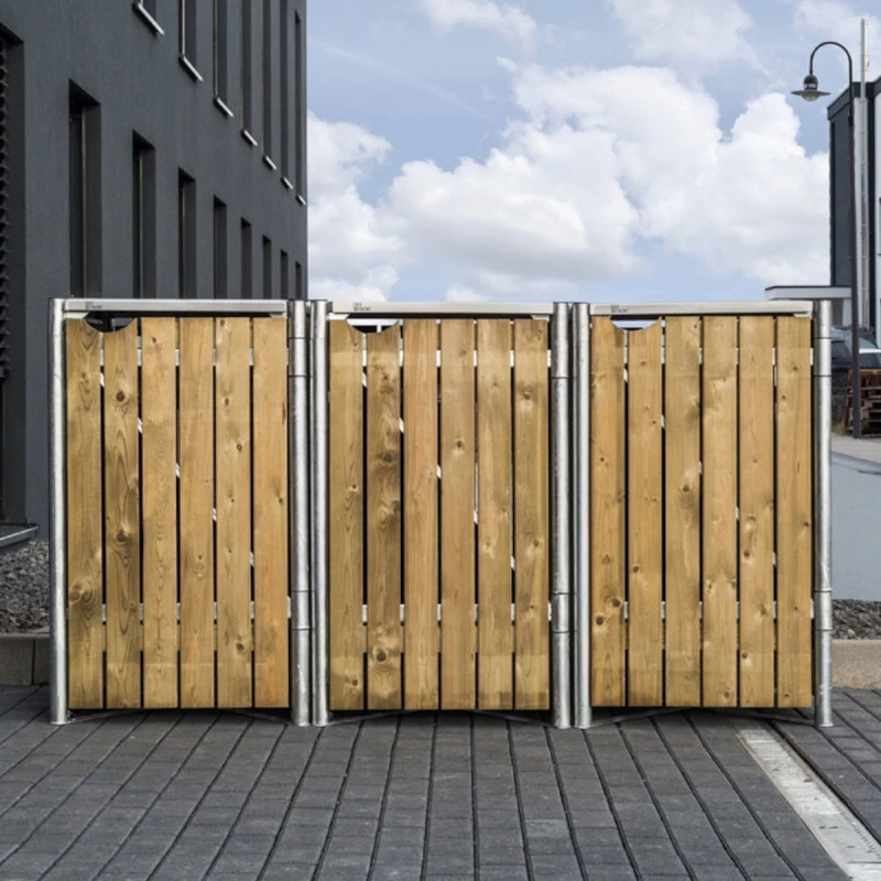 Avec ses 3 compartiments, le cache-poubelle Hide vous permettra de pratiquer un tri sélectif en un simple geste. Réalisé avec des matériaux de première qualité, ce cache-poubelle accueille 3 conteneurs à déchets d’un volume de 240L chacun. Le cadre est en acier galvanisé à chaud et les parois sont planchettes de pin traité, pour une durabilité et une solidité inégalées. Le pin a subi un traitement par imprégnation, contre les moisissures et les insectes xylophages. Le bois utilisé est certifié PEFC et provient de forêts gérées de façon responsable et dans le respect de l’environnement.