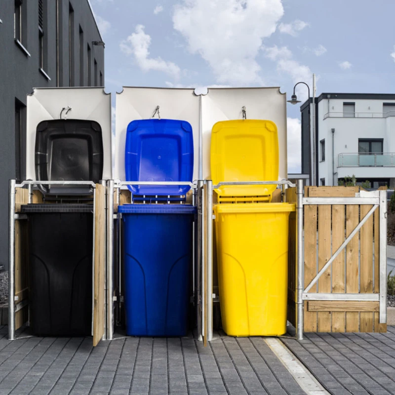 Ce modèle est prévu pour une utilisation en extérieur, il ne craint pas les intempéries et ne demande aucun entretien spécifique. Chaque compartiment est muni d’un portillon ouvrable sur la face avant et d’un couvercle avec crochet et cordelette pour une ouverture automatique de votre conteneur à déchets.