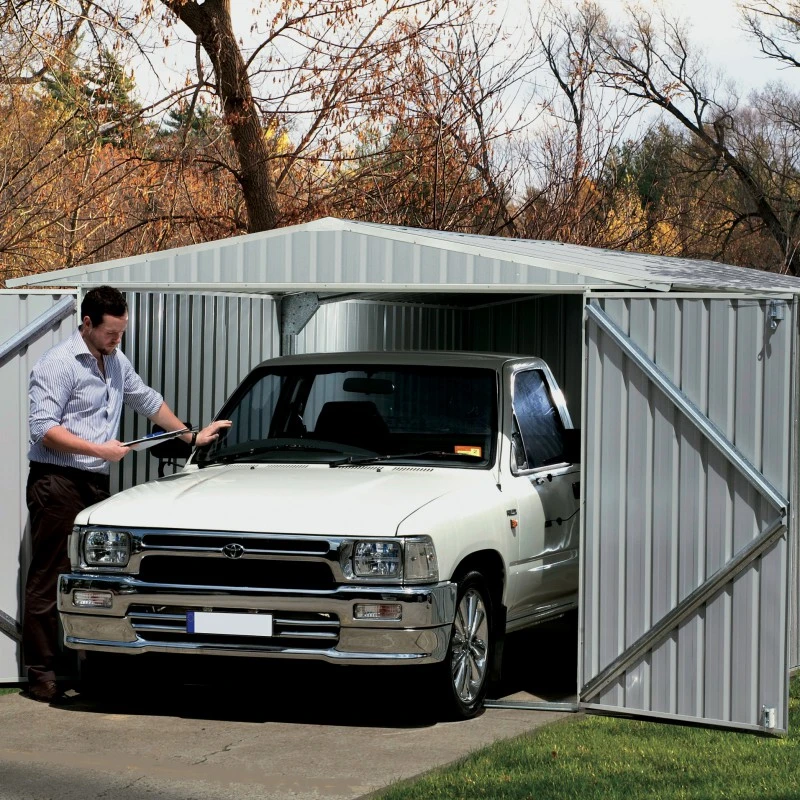 Garage à fonctions multiples – abri sûr pour votre voiture, rangement remorque ou bateau, ou grand entrepôt pour vos outils et mobilier de jardin, le modèle en acier nervuré Melton figure parmi les produits phares du fabricant Absco.