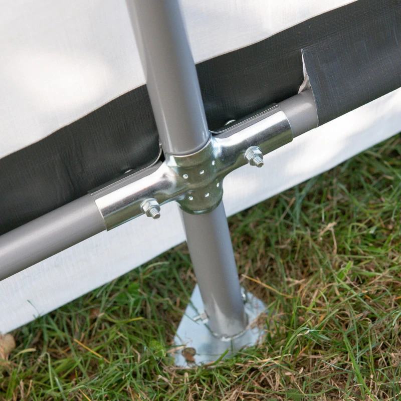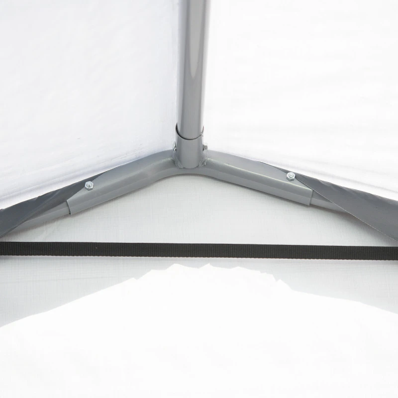 La toile est maintenue en place solidement grâce aux sangles d’arrimage à cliquet qui se fixent sur la structure. Pour une tension optimale de la toile, le système de traverses coulissantes se verrouille et positionne la structure pour qu’elle demeure parfaitement ajustée à la bâche. Cet abri démontable s’installe rapidement et ne requiert aucun outillage spécifique. Il peut être utilisé de manière saisonnière ou tout au long de l’année. L’installation doit se faire sur un sol relativement nivelé avec les 4 pieds d’ancrage fournis.