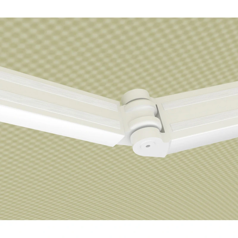 Le bras articulé, véritable colonne vertébrale du store extérieur rétractable est conçu en acier galvanisé très résistant lui permettant de résister aux multiples agressions extérieures. La barre frontale, le rouleau ainsi que les supports sont quant à eux en aluminium. L’ensemble des éléments sont recouverts d’une peinture blanche RAL9010 pour une association parfaite avec la couleur beige de la toile.