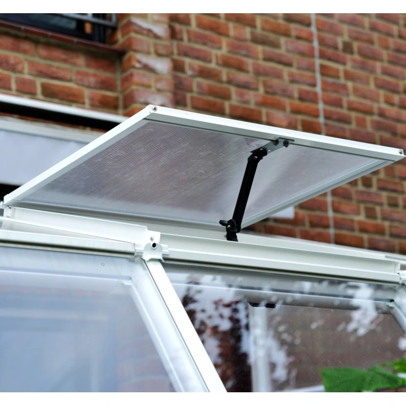 Tous les panneaux sont anti-UV, pratiquement incassables et ne se décolorent pas dans le temps. La porte, également en vitrage acrylique transparent, est fournie avec une serrure, et dans la toiture une lucarne de ventilation ouvrable permet la gestion de la chaleur.